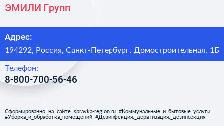 ЭМИЛИ Групп по адресу 194292, Россия, Санкт-Петербург, Домостроительная, 1Б в дальнейшем Организация, размещена в следующих категориях: