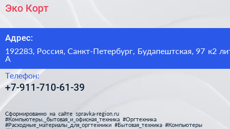 Эко-Корт по адресу 192283, Россия, Санкт-Петербург, Будапештская, 97 к2 лит А в дальнейшем Организация, размещена в следующих категориях: