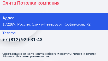 Элита Потолки, компания по адресу 192289, Россия, Санкт-Петербург, Софийская, 72 в дальнейшем Организация, размещена в следующих категориях: