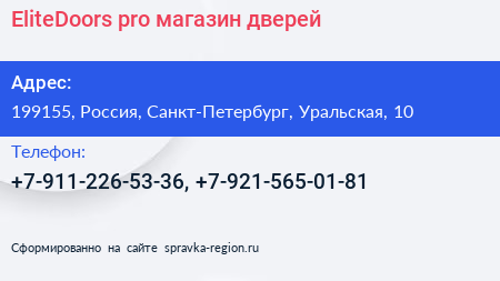 EliteDoors.pro, магазин дверей по адресу 199155, Россия, Санкт-Петербург, Уральская, 10 в дальнейшем Организация, размещена в следующих категориях: