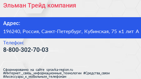 Эльман-Трейд, компания по адресу 196240, Россия, Санкт-Петербург, Кубинская, 75 к1 лит А в дальнейшем Организация, размещена в следующих категориях: