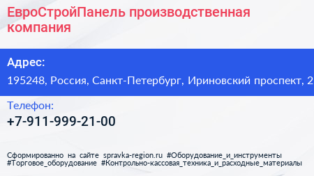 ЕвроСтройПанель, производственная компания по адресу 195248, Россия, Санкт-Петербург, Ириновский проспект, 2 в дальнейшем Организация, размещена в следующих категориях: