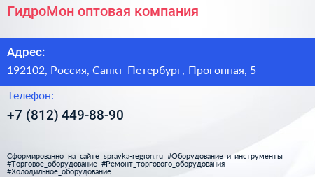 ГидроМон, оптовая компания по адресу 192102, Россия, Санкт-Петербург, Прогонная, 5 в дальнейшем Организация, размещена в следующих категориях:
