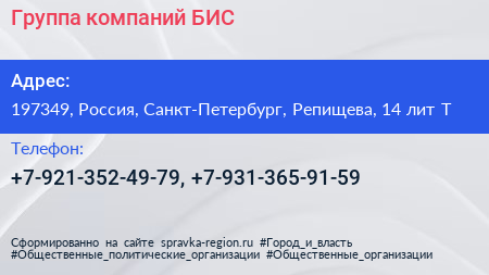 Группа компаний БИС по адресу 197349, Россия, Санкт-Петербург, Репищева, 14 лит Т в дальнейшем Организация, размещена в следующих категориях: