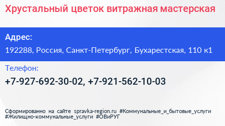 Хрустальный цветок, витражная мастерская по адресу 192288, Россия, Санкт-Петербург, Бухарестская, 110 к1 в дальнейшем Организация, размещена в следующих категориях:
