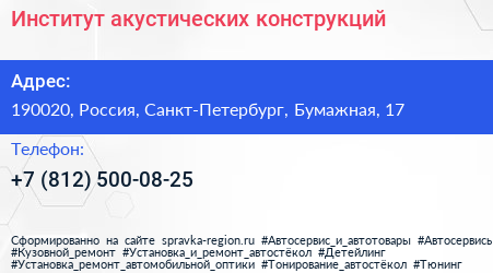 Институт акустических конструкций по адресу 190020, Россия, Санкт-Петербург, Бумажная, 17 в дальнейшем Организация, размещена в следующих категориях:
