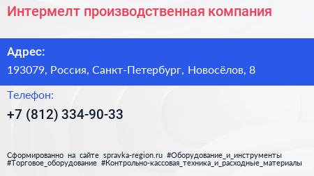 Интермелт, производственная компания по адресу 193079, Россия, Санкт-Петербург, Новосёлов, 8 в дальнейшем Организация, размещена в следующих категориях: