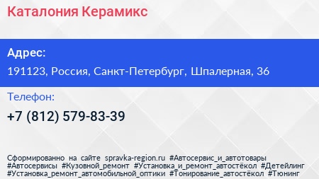 Каталония Керамикс по адресу 191123, Россия, Санкт-Петербург, Шпалерная, 36 в дальнейшем Организация, размещена в следующих категориях: