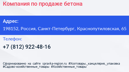 Компания по продаже бетона по адресу 198152, Россия, Санкт-Петербург, Краснопутиловская, 65 в дальнейшем Организация, размещена в следующих категориях: