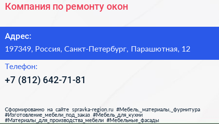 Компания по ремонту окон по адресу 197349, Россия, Санкт-Петербург, Парашютная, 12 в дальнейшем Организация, размещена в следующих категориях: