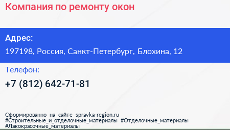 Компания по ремонту окон по адресу 197198, Россия, Санкт-Петербург, Блохина, 12 в дальнейшем Организация, размещена в следующих категориях: