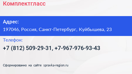 Комплектгласс по адресу 197046, Россия, Санкт-Петербург, Куйбышева, 23 в дальнейшем Организация, размещена в следующих категориях: