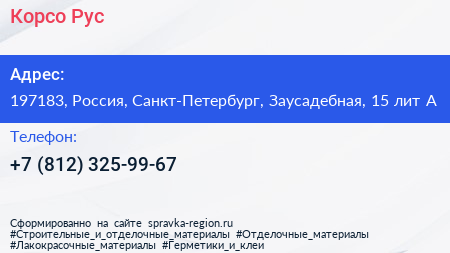Корсо Рус по адресу 197183, Россия, Санкт-Петербург, Заусадебная, 15 лит А в дальнейшем Организация, размещена в следующих категориях: