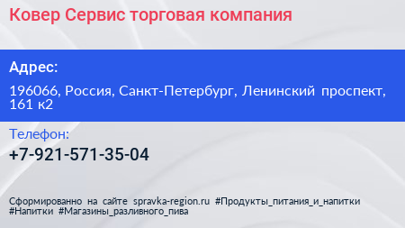 Ковер-Сервис, торговая компания по адресу 196066, Россия, Санкт-Петербург, Ленинский проспект, 161 к2 в дальнейшем Организация, размещена в следующих категориях: