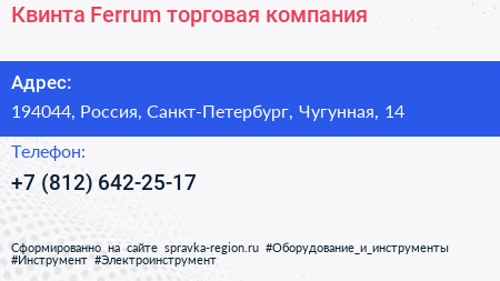 Квинта Ferrum, торговая компания по адресу 194044, Россия, Санкт-Петербург, Чугунная, 14 в дальнейшем Организация, размещена в следующих категориях: