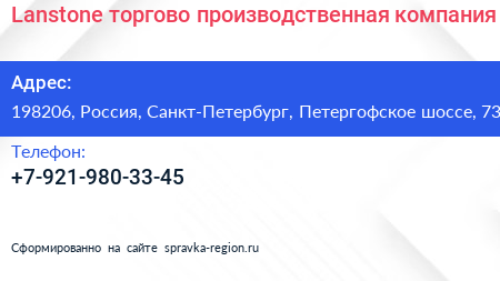 Lanstone, торгово-производственная компания по адресу 198206, Россия, Санкт-Петербург, Петергофское шоссе, 73 в дальнейшем Организация, размещена в следующих категориях: