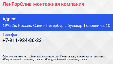 ЛенГорСлив, монтажная компания по адресу 199226, Россия, Санкт-Петербург, бульвар Головнина, 10 в дальнейшем Организация, размещена в следующих категориях: