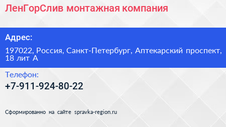 ЛенГорСлив, монтажная компания по адресу 197022, Россия, Санкт-Петербург, Аптекарский проспект, 18 лит А в дальнейшем Организация, размещена в следующих категориях:
