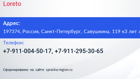 Loreto по адресу 197374, Россия, Санкт-Петербург, Савушкина, 119 к3 лит А в дальнейшем Организация, размещена в следующих категориях: