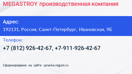 MEGASTROY, производственная компания по адресу 192131, Россия, Санкт-Петербург, Ивановская, 9Б в дальнейшем Организация, размещена в следующих категориях: