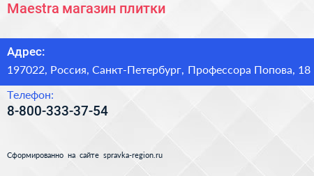 Maestra, магазин плитки по адресу 197022, Россия, Санкт-Петербург, Профессора Попова, 18 в дальнейшем Организация, размещена в следующих категориях: