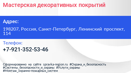 Мастерская декоративных покрытий по адресу 198207, Россия, Санкт-Петербург, Ленинский проспект, 114 в дальнейшем Организация, размещена в следующих категориях: