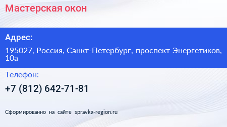 Мастерская окон по адресу 195027, Россия, Санкт-Петербург, проспект Энергетиков, 10а в дальнейшем Организация, размещена в следующих категориях: