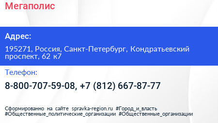 Мегаполис по адресу 195271, Россия, Санкт-Петербург, Кондратьевский проспект, 62 к7 в дальнейшем Организация, размещена в следующих категориях: