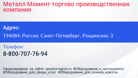 Металл Момент, торгово-производственная компания по адресу 196084, Россия, Санкт-Петербург, Рощинская, 3 в дальнейшем Организация, размещена в следующих категориях: