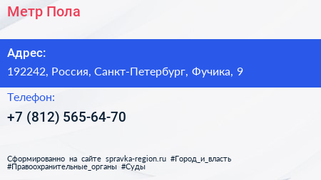 Метр Пола по адресу 192242, Россия, Санкт-Петербург, Фучика, 9 в дальнейшем Организация, размещена в следующих категориях:
