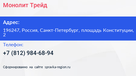 Монолит Трейд по адресу 196247, Россия, Санкт-Петербург, площадь Конституции, 2 в дальнейшем Организация, размещена в следующих категориях:
