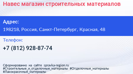 Навес, магазин строительных материалов по адресу 198218, Россия, Санкт-Петербург, Красная, 48 в дальнейшем Организация, размещена в следующих категориях:
