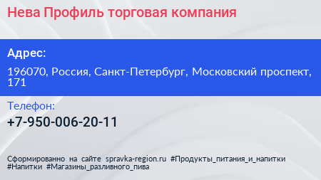 Нева Профиль, торговая компания по адресу 196070, Россия, Санкт-Петербург, Московский проспект, 171 в дальнейшем Организация, размещена в следующих категориях: