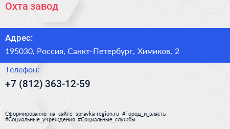 Охта, завод по адресу 195030, Россия, Санкт-Петербург, Химиков, 2 в дальнейшем Организация, размещена в следующих категориях: