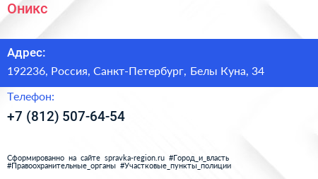 Оникс по адресу 192236, Россия, Санкт-Петербург, Белы Куна, 34 в дальнейшем Организация, размещена в следующих категориях: