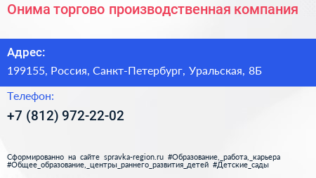 Онима, торгово-производственная компания по адресу 199155, Россия, Санкт-Петербург, Уральская, 8Б в дальнейшем Организация, размещена в следующих категориях: