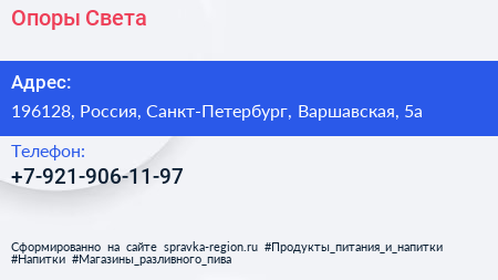 Опоры Света по адресу 196128, Россия, Санкт-Петербург, Варшавская, 5а в дальнейшем Организация, размещена в следующих категориях: