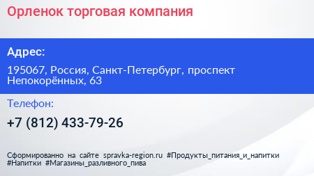 Орленок, торговая компания по адресу 195067, Россия, Санкт-Петербург, проспект Непокорённых, 63 в дальнейшем Организация, размещена в следующих категориях: