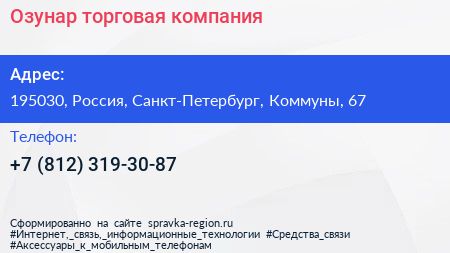 Озунар, торговая компания по адресу 195030, Россия, Санкт-Петербург, Коммуны, 67 в дальнейшем Организация, размещена в следующих категориях: