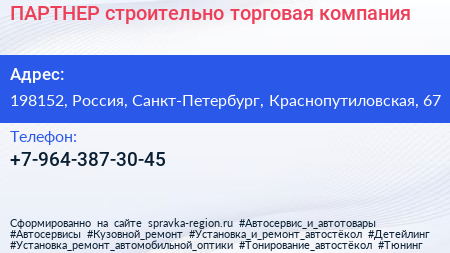 ПАРТНЕР, строительно-торговая компания по адресу 198152, Россия, Санкт-Петербург, Краснопутиловская, 67 в дальнейшем Организация, размещена в следующих категориях: