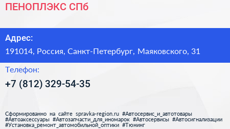 ПЕНОПЛЭКС СПб по адресу 191014, Россия, Санкт-Петербург, Маяковского, 31 в дальнейшем Организация, размещена в следующих категориях: