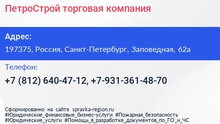 ПетроСтрой, торговая компания по адресу 197375, Россия, Санкт-Петербург, Заповедная, 62а в дальнейшем Организация, размещена в следующих категориях: