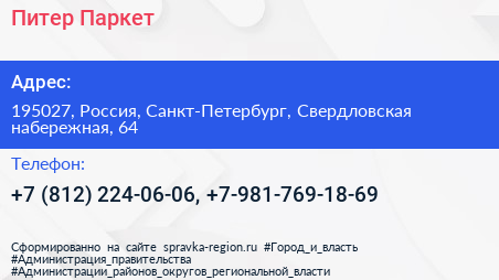Питер Паркет по адресу 195027, Россия, Санкт-Петербург, Свердловская набережная, 64 в дальнейшем Организация, размещена в следующих категориях:
