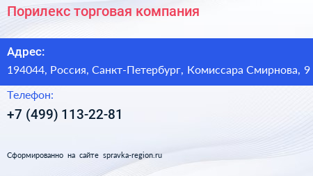 Порилекс, торговая компания по адресу 194044, Россия, Санкт-Петербург, Комиссара Смирнова, 9 в дальнейшем Организация, размещена в следующих категориях: