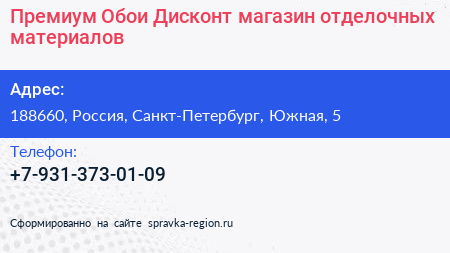 Премиум Обои Дисконт, магазин отделочных материалов по адресу 188660, Россия, Санкт-Петербург, Южная, 5 в дальнейшем Организация, размещена в следующих категориях:
