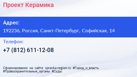 Проект-Керамика по адресу 192236, Россия, Санкт-Петербург, Софийская, 14 в дальнейшем Организация, размещена в следующих категориях: