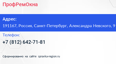 ПрофРемОкна по адресу 191167, Россия, Санкт-Петербург, Александра Невского, 9 в дальнейшем Организация, размещена в следующих категориях: