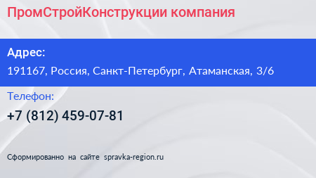 ПромСтройКонструкции, компания по адресу 191167, Россия, Санкт-Петербург, Атаманская, 3/6 в дальнейшем Организация, размещена в следующих категориях: