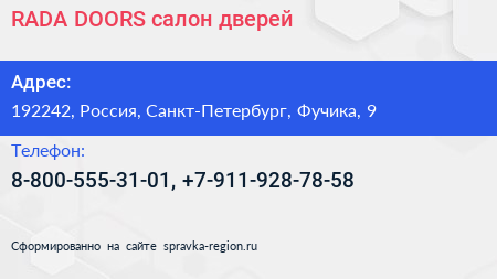 RADA DOORS, салон дверей по адресу 192242, Россия, Санкт-Петербург, Фучика, 9 в дальнейшем Организация, размещена в следующих категориях: