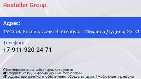 Restaller Group по адресу 194358, Россия, Санкт-Петербург, Михаила Дудина, 23 к1 в дальнейшем Организация, размещена в следующих категориях: